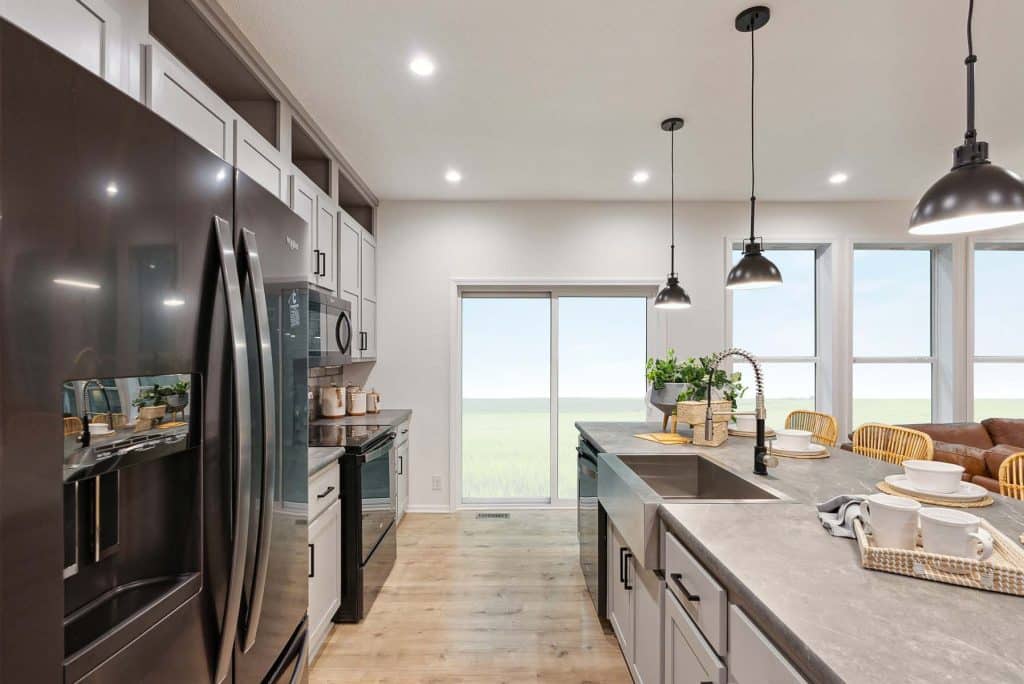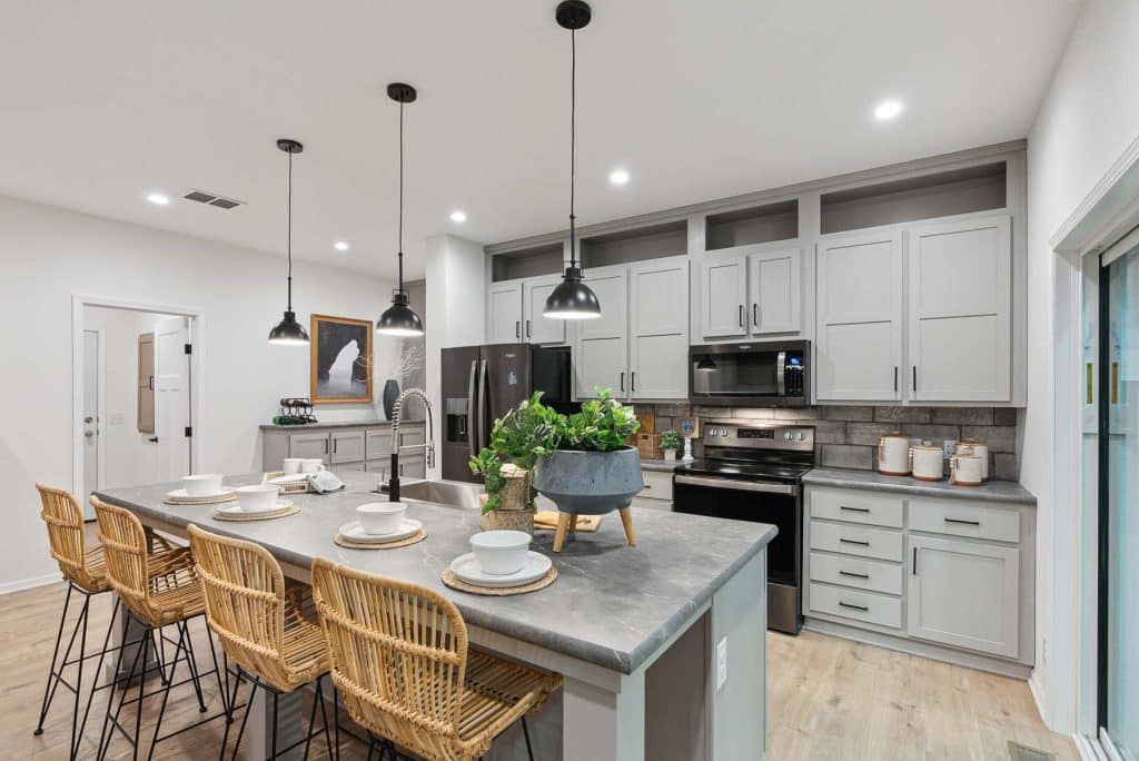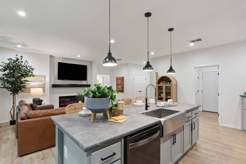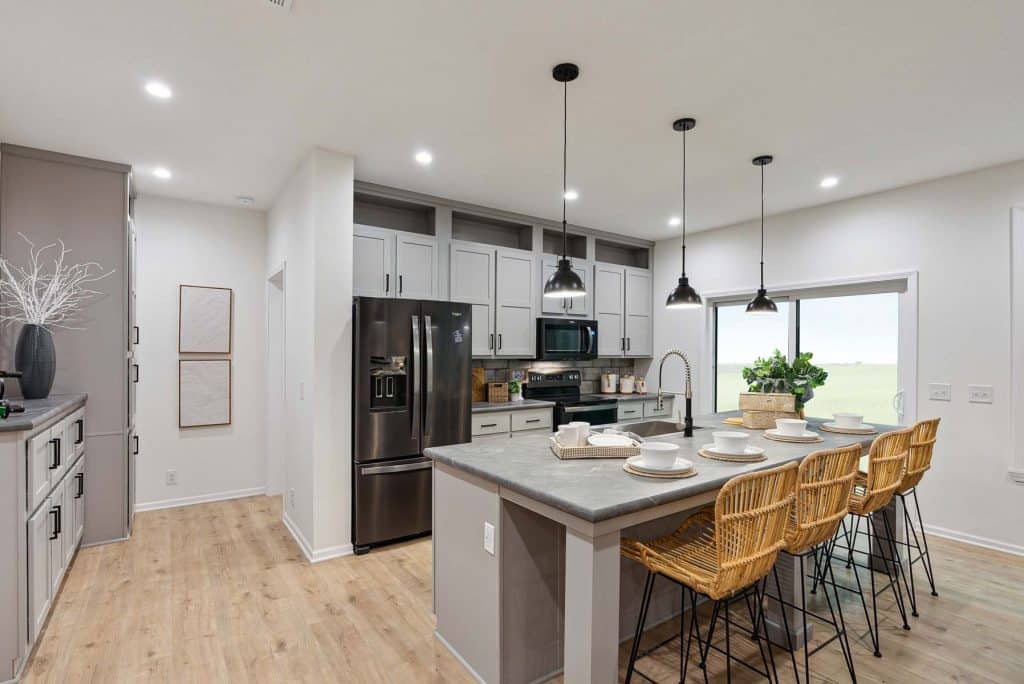 The open-concept layout connects the kitchen, dining, and living areas into one spacious central gathering space, ideal for both daily life and entertaining. The kitchen features a large island, and generous cabinet storage, making it as practical as it is inviting.